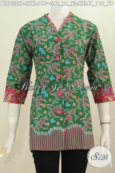 Baju Blus Batik Hijau Motif Unik Desain Mewah Model Plisir Kerah Polos, Busana Batik Printing Trendy Tampil Gaya Dan Mempesona [BLS4339P-S , XXL]