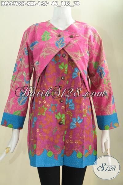 Baju Blus Batik Jumbo Buatan Solo Desain Mewah Warna Berkelas Proses Printing, Produk Busana Batik Wanita Gemuk Model Kombinasi Balero Tampil Makin Keren [BLS3798P-XXL]