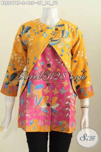Baju Blus Batik Kuning Kombinasi Pink, Baju Batik Wanita Muda Kombinasi Rompi Model Lengan Panjang Untuk Tampil Lebih Anggun [BLS5976P-S]