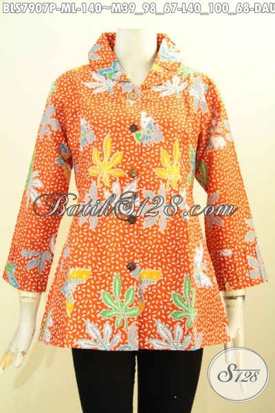 Baju Blus Batik Warna Oranye, Baju Batik Trendy Pakai Ofneisel Di Krah Dan Lengan Berbahan Halus Motif Daun Pepaya Harga 140K [BLS7907P-M]