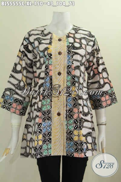 Baju Blus Dual Warna Motif Kombinasi, Pakaian Batik Model Tanpa Kerah Deain Istimewa Proses Cap Tampil Cantik Dan Stylish [BLS5555C-XL]
