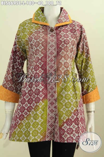 Baju Blus Kerah Plesir Size L, Pakaian Batik Solo Untuk Wanita Karir Tampil Mempesona, Baju Blus Bertali Motif Elegan Proses Cap Hanya 180K [BLS6695C-L]