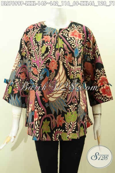 Baju Blus Keren Bahan Batik Solo, Pakaian Batik Modis Model Pita Resleting Depan Kwalitas Istimewa Harga Biasa [BLS7699P-L , XXL]