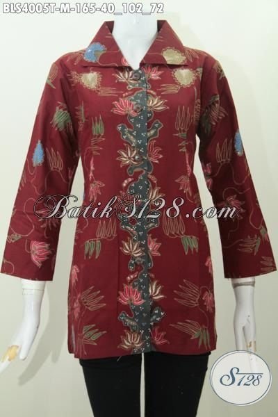 Baju Blus Merah Berbahan Batik Tulis Dengan Motif Keren Dan Mewah, Pakaian Batik Masa Kini Kerah Kotan Modis Untuk Acara Formal [BLS4005T-M]