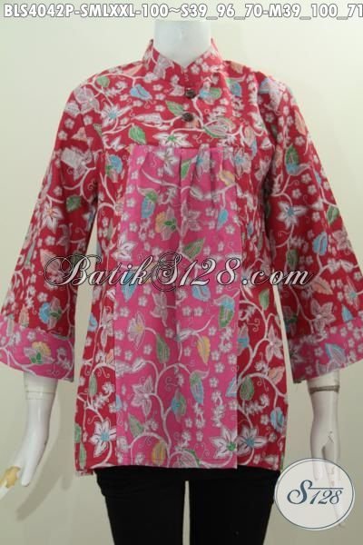 Baju Blus Merah Motif Terndy Desain Kerah Shanghai Mekar, Produk Baju Batik Printing Solo Kwalitas Mewah Harga Murah Meriah [BLS4042P-S , M , L , XXL]