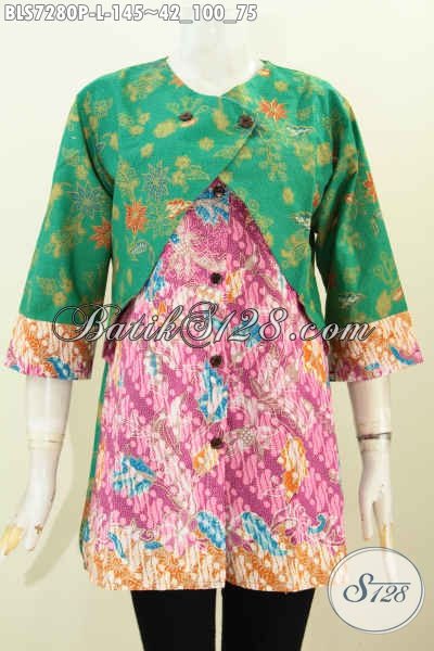 Baju Blus Modis Keren Berkelas, Baju Batik Atasan Wanita Modern Bahan Halus Motif Trendy Proses Printing Hanya 100 Ribuan, Model Kombinasi Rompi Sambung [BLS7280P-L]