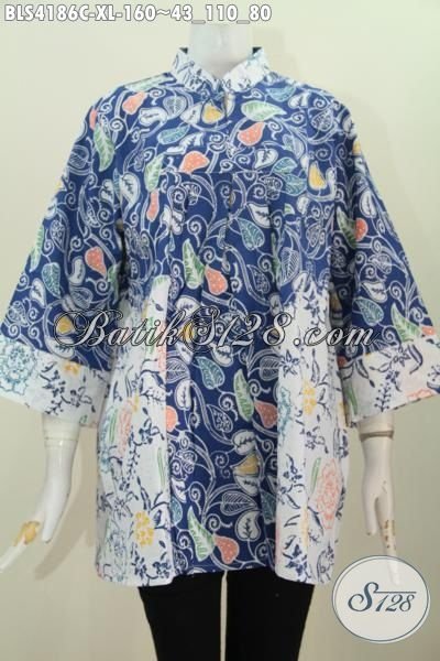 Baju Blus Modis Perempuan Dewasa Kerah Shanghai Kombinasi Birud Dan Putih, Baju Batik Dua Motif Proses Cap Terlihat Gaya Dan Beda [BLS4186C-XL]