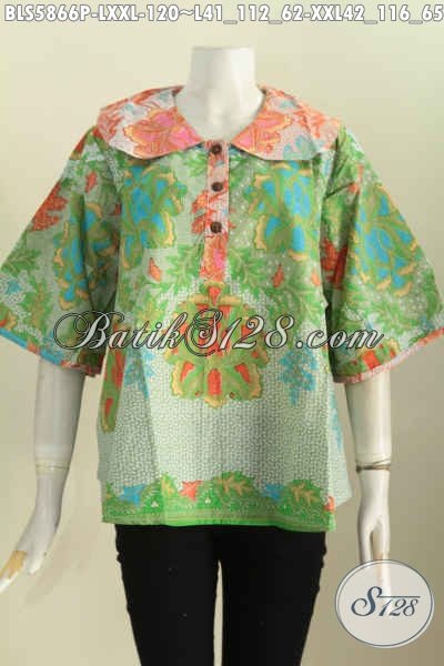 Baju Blus Motif Bunga, Pakaian Batik Hijau Proses Printing Model Kerah Bulat Yang Bikin Wanita Terlihat Modis Dan Cantik [BLS5866P-L , XXL]