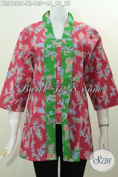 Baju Blus Warna Merah Motif Bunga, Busana Batik Kerah Kartini Aksen Hijau Berbahan Halus Dan Adem Nyaman Di Pakai Di Cuaca Yang Panas Sekalipun [BLS4052P-XL]