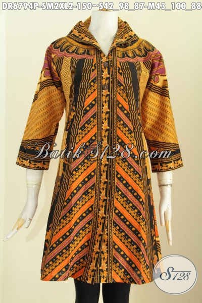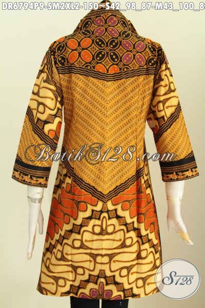 Baju Dress Batik Elegan Motif Sinaran, Busana Batik Klasik Kerja Wanita Terbaru Model Kerah V Proses Printing 150K [DR6794P-S , M , XL]