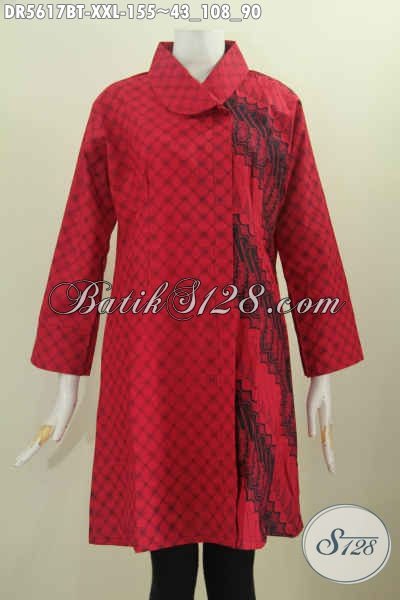 Baju Dress Batik Istimewa, Pakaian Batik Halus Kwalitas Istimewa Model Kerah Miring Warna Monokrom Size XXL Spesial Buat Perempuan Gemuk [DR5617BT-XXL]