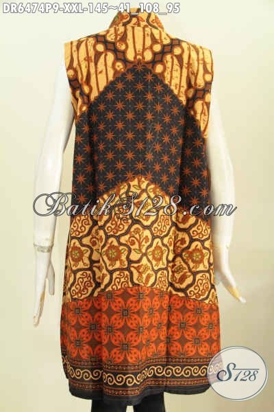 Baju Dress Batik Jumbo Model Tanpa Lengan, Pakaian Batik Klasik Sinaran Bahan Adem Kwalitas Istimewa Tampil Mempesona [DR6474P-XXL]
