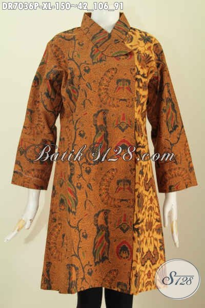 Baju Dress Batik Klasik Untuk Wanita Karir Dewasa, Busana Batik Elegan Kerah Miring Buatan Solo Proses Printing Hanya 150 Ribu [DR7036P-XL]