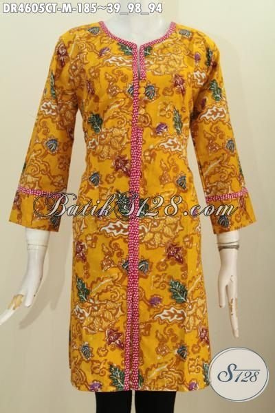 Baju Dress Batik Kuning Model Kancing Depan Kwalitas Bagus Motif Trendy, Busana Batik Jawa Tengah Proses Cap Tulis Istimewa Untuk Penampilan Lebih Anggun Mempesona [DR4605CT-M]