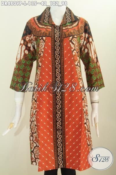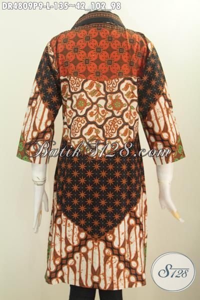 Baju Dress Batik Solo Klasik Sinaran, Pakaian Batik Elegan Proses Printing Berkelas Model Kerah Lancip, Busana Batik Halus Untuk Kondangan Daleman Non Furing [BLS4809P-L]