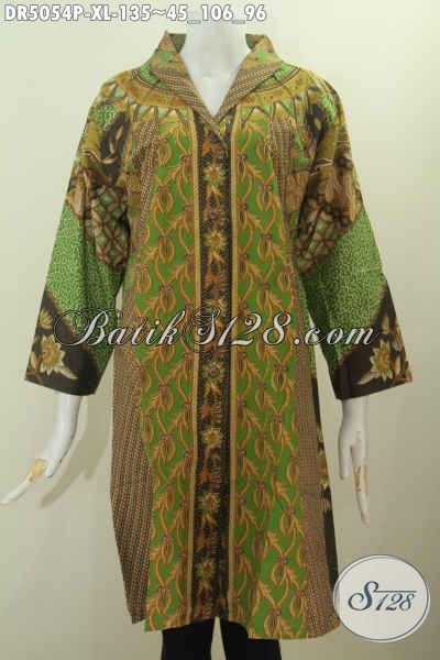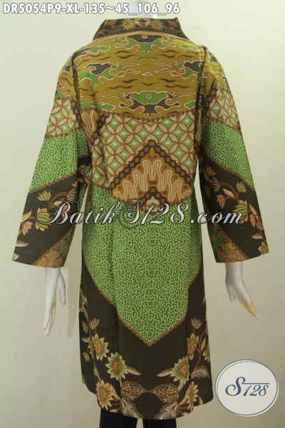 Baju Dress Hijau Ukuran XL, Busana Batik Elegan Motif Klasik Proses Printing Model Kerah Langsung Bikin Wanita Terlihat Anggun Mempesona [DR5054P-XL]