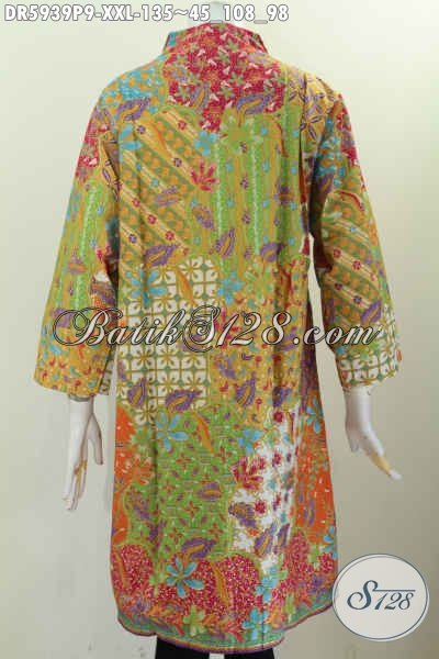 Baju Dress Jumbo Bahan Batik Printing, Busana Batik Halus Dan Istimewa Buatan Solo Untuk Wanita Gemuk Tampil Gaya Mode Kerah Langsung [DR5939P-XXL]
