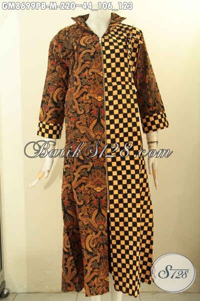 Baju Gamis Dual Motif, Busana Batik Wanita Untuk Tampil Gaya Dan Syar’i, Bahan Adem Desain Resleting Depan Hanya 200 Ribuan [GM8699PB-M]