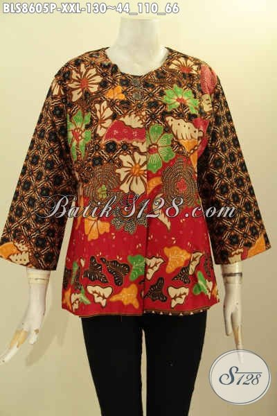 Baju Kemeja Batik Blouse Big Size Tanpa Krah, Pakaian Batik Wanita Gemuk Motif Elegan Dan Mewah Proses Printing Di Lengkapi Kancing Depan Hanya 130K [BLS8605P-XXL]
