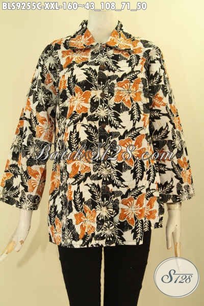 Batik Blouse Istimewa Spesial Buat Wanita Gemuk, Baju Batik Modern Motif Terkini Jenis Cap Model Kerah Lancip Lengan 7/8, Pas Banget Untuk Kerja [BLS9255C-XXL]
