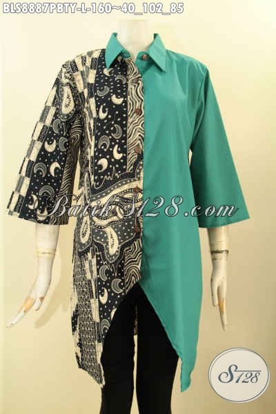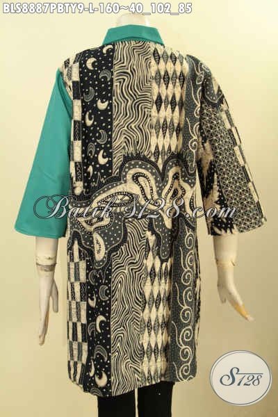 Batik Blouse Modern Lengan 3/4, Busana Batik Wanita Masa Kini Model Kerah Lancip Motif Elegan Kombinasi Katun Polos Toyobo, Pas Untuk Kerja Dan Kondangan [BLS8887PBTY-L]