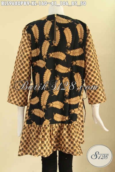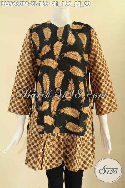Batik Blouse Wanita Kerja 2 Motif Lengan 7/8, Pakaian Batik Modis Tanpa Krah Dengan Resleting Belakang Dan Pakai Tali Di Bagian Pinggang Kanan Kiri [BLS9680PB-XL]