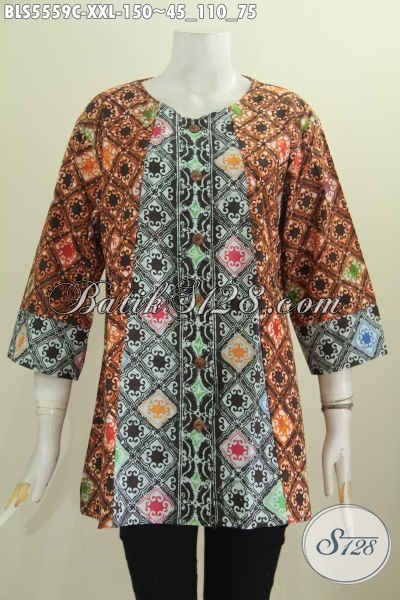 Batik Blus Dua Motif, Pakaian Batik Dua Warna Proses Cap Bahan Halus Dan Adem Model Tanpa Kerah Spesial Untuk Perempuan Gemuk [BLS5559C-XXL]