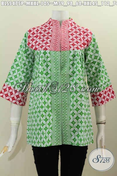Batik Blus Kerah Langsung Dengan Desain Trendy Kombinasi Warna Hijau Dan Merah Motif Kawung, Baju Batik Printing Dari Solo Untuk Penampilan Terlihat Modis [BLS5475P-M , XXL]