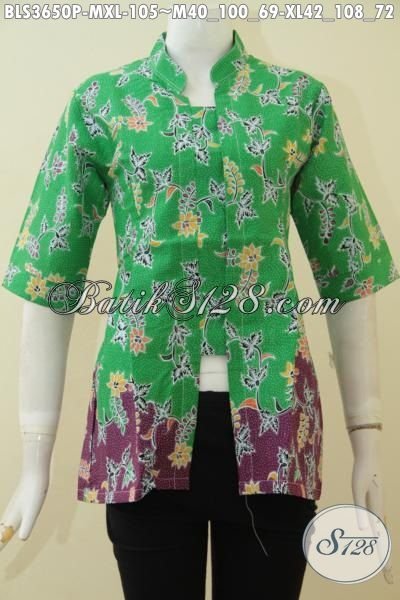 Batik Blus Keren Penunjang Penampilan Wanita Karir Masa Kini, Baju Batik Hijau Kombinasi Ungu Motif Bunga Proses Print Model Yang Di Sukai [BLS3650P-M , XL]