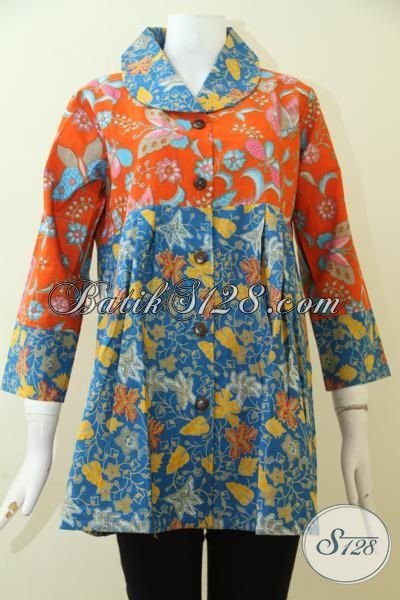 Batik Blus Model Paling Baru Dengan Kombinasi Warna Orange Dan Biru, Batik Print Halus Murah Meriah [BLS2503-L]