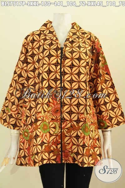 Batik Blus Resti Motif Kawung, Busana Batik Printing Istimewa Untuk Tampil Elegan Dengan Kerah Langsung Dan Kancing Resleting Depan, Asli Dari Solo [BLS7517P-L , XXL]
