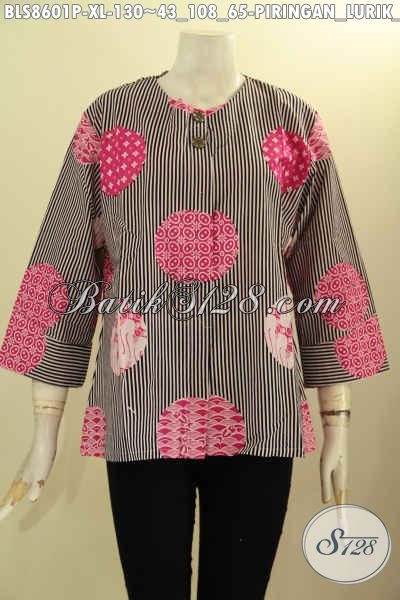 Batik Blus Solo Jawa Tengah Model Kemeja Tanpa Krah, Busana Batik Modis Kancing Depan Motif Piringan Lurik Hitam Proses Printing Hanya 130K [BLS8601P-XL]