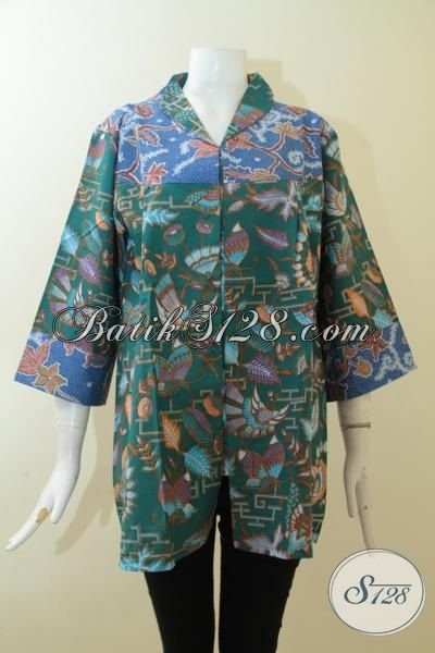 Batik Blus Solo Murmer Kwalitas Halus, Batik Untuk Ke Kantor Wanita Karir, Pakaian Batik Proses Printing Warna Hijau Tua Kombinasi Biru [BLS3001P-XXL]