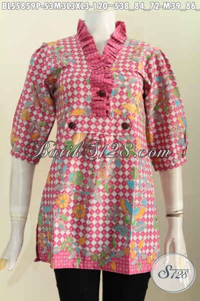 Batik Blus Warna Pink Motif Unik Dan Keren Proses Printing, Baju Batik Solo Desain Krah Rempel Lengan 3/4 Harga 120K [BLS5859P-S , M , L , XL]