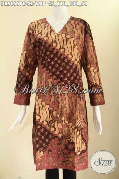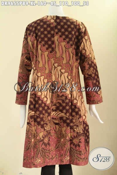 Batik Dress Asli Buatan Solo, Busana Batik Modern Khas Jawa Tengah Kwalitas Istimewa Motif Elegan Bahan Halus Nyaman Di Pakai, Model Resleting Belakang Lengan 7/8 [DR9655PB-XL]