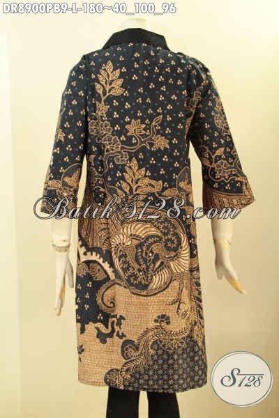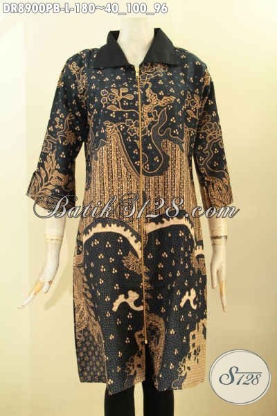 Batik Dress Desain Kerah Polos, Baju Batik Modern Dengan Resleting Depan Tren Masa Kini, Busana Batik Solo Modis Motif Keren Bahan Halus Yang Nyaman Di Pakai [DR8900PB-L]