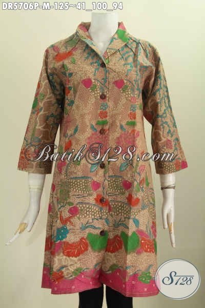 Batik Dress Elegan, Pakaian Batik Wanita Model Terusan Kerah Langsung Buatan Solo Proses Printing Hanya 125K [DR5706P-M]