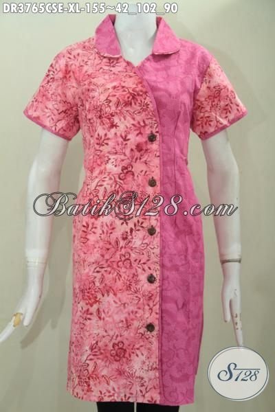 Batik Dress Halus Bahan Katun Dan Embos, Batik Kerja Warn Pink Dual Motif Desain Terbaru Asli Solo, Pilihan Tepat Tampil Cantik Maksimal [DR3765CSE-XL]