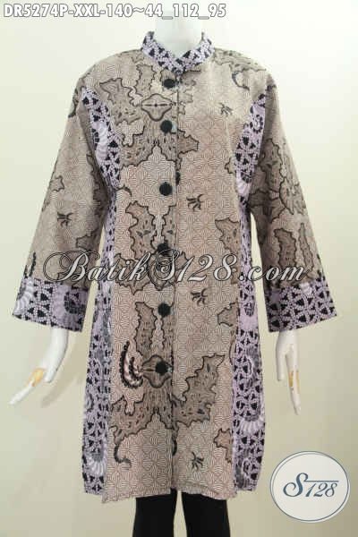 Batik Dress Jumbo Berbahan Halus Dan Adem, Pakaian Batik Halus Nan Istimewa Desain Kerah Paspol Shanghai Motif Mewah Proses Printing Ukuran XXL Untuk Wanita Gemuk [DR5274P-XXL]