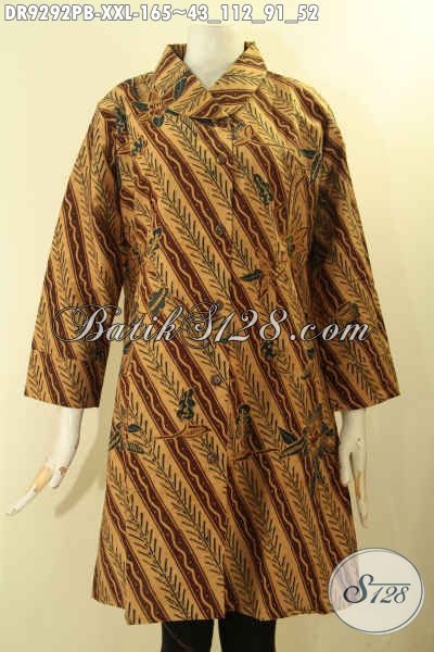 Batik Dress Kerah Miring Bahan Halus Nyaman Di Pakai, Baju Batik Wanita Gemuk Kancing Depan Lengan 7/8 Motif Elegan Printing Cabut, Pas Buat Kerja Kantoran [DR9292PB-XXL]