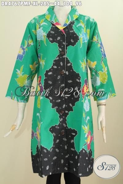 Batik Dress Kwalitas Bagus Bahan Halus Motif Trendy Kombinasi Tulis, Busana Batik Mewah Buatan Solo Daleman Full Tricot Untuk Wanita Dewasa Tampil Modis Mempesona [DR4767PMF-XL]