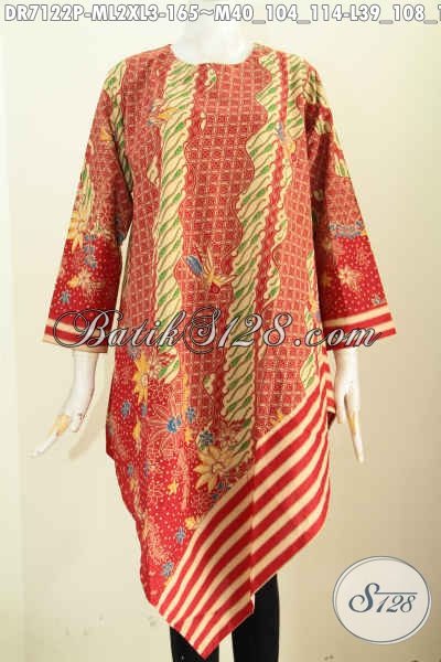Batik Dress Merah Keren Model Taplak, Busana Batik Motif Slarak Proses Printing Dengan Resleting Belakang, Pas Untuk Ke Pesta [DR7122P-M , L , XL]