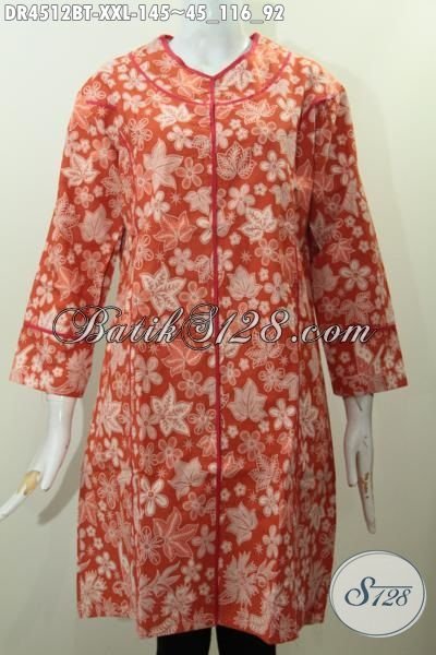 Batik Dress Orange Model Plisir Kain Polos Motif Terbaru Proses Kombinasi Tulis, Busana Batik 3L Exclusive Buat Perempuan Berbadan Gemuk [DR4512BT-XXL]