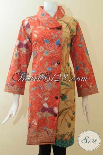 Batik Dress Warna Orange Kombinasi Coklat Muda Berpadu Motif Bunga Desain Masa Kini, Batik Kerja Wanita Muda Dan Dewasa Tampil Beda [DR2935PL-XXL]