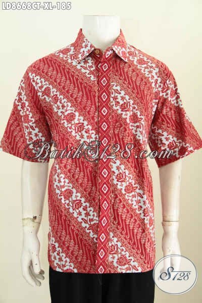 Batik Hem Klasik ELegan Warna Merah Cerah Motif Parang, Baju Batik Berkelas Proses Cap Tulis Model Lengan Pendek Desain 2017 [LD8668CT-XL]
