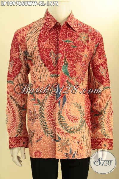 Batik Hem Solo Bahan Sutra Twis Lengan Panjang Warna Merah, Pakaian Batik Premium Full Furing Motif Berkelas Proses Tulis Asli, Pria Terlihat Gagah Berwibawa [LP10976SUWTF-XL]
