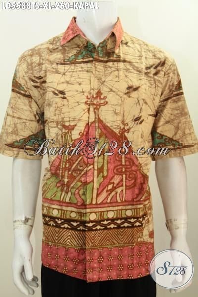 Batik Kemeja Motif Kapal Proses Tulis Pewarna Soga, Busana Batik Etnik Desain Trendy Lengan Pendek Membuat Pria Terligan Mempesona [LD5588TS-XL]