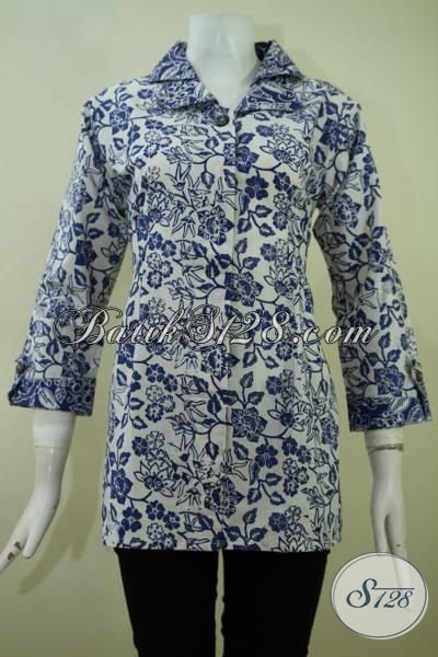 Batik Kerja Dasar Putih Dengan Motif Biru Lengan Tujuh Perdelapan, Blus Batik Trendy Yang Fashionable [BLS2364C-M]