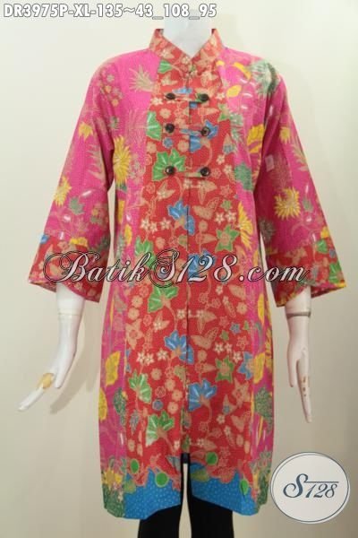 Batik Pink Motif Bunga Buat Wanita Dewasa, Dress Batik Kerah Shanghai Berbahan Halus Proses Printing Murah Meriah [DR3975P-XL]
