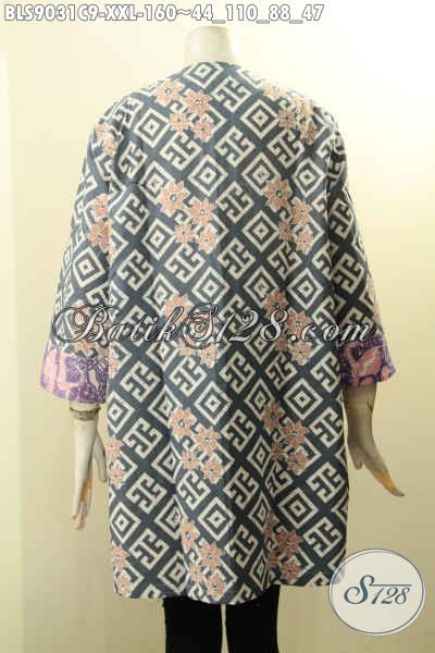 Blouse Batik Big Size Desain Trendy Motif Elegan Proses Cap, Pakaian Batik Kekinian Untuk Wanita Gemuk Lengan Panjang 7/8 Kancing Depan, Penampilan Modis Dan Kece [BLS9031C-XXL]